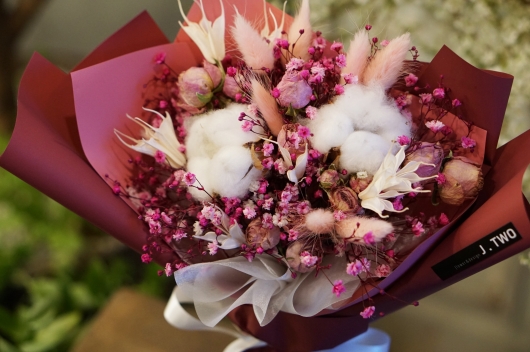 목화와 프리저브드플라워로 제작한 꽃다발 입니다.